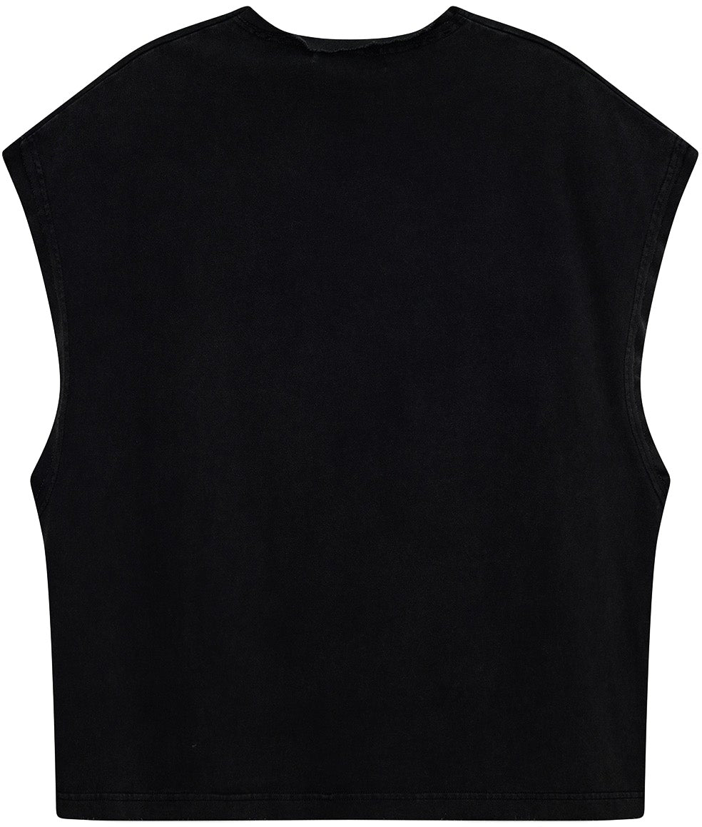 Top nero senza maniche in cotone dalla texture morbida e consumata e dalle finiture pulite, dal taglio comodo e dallo stile urbano audace.